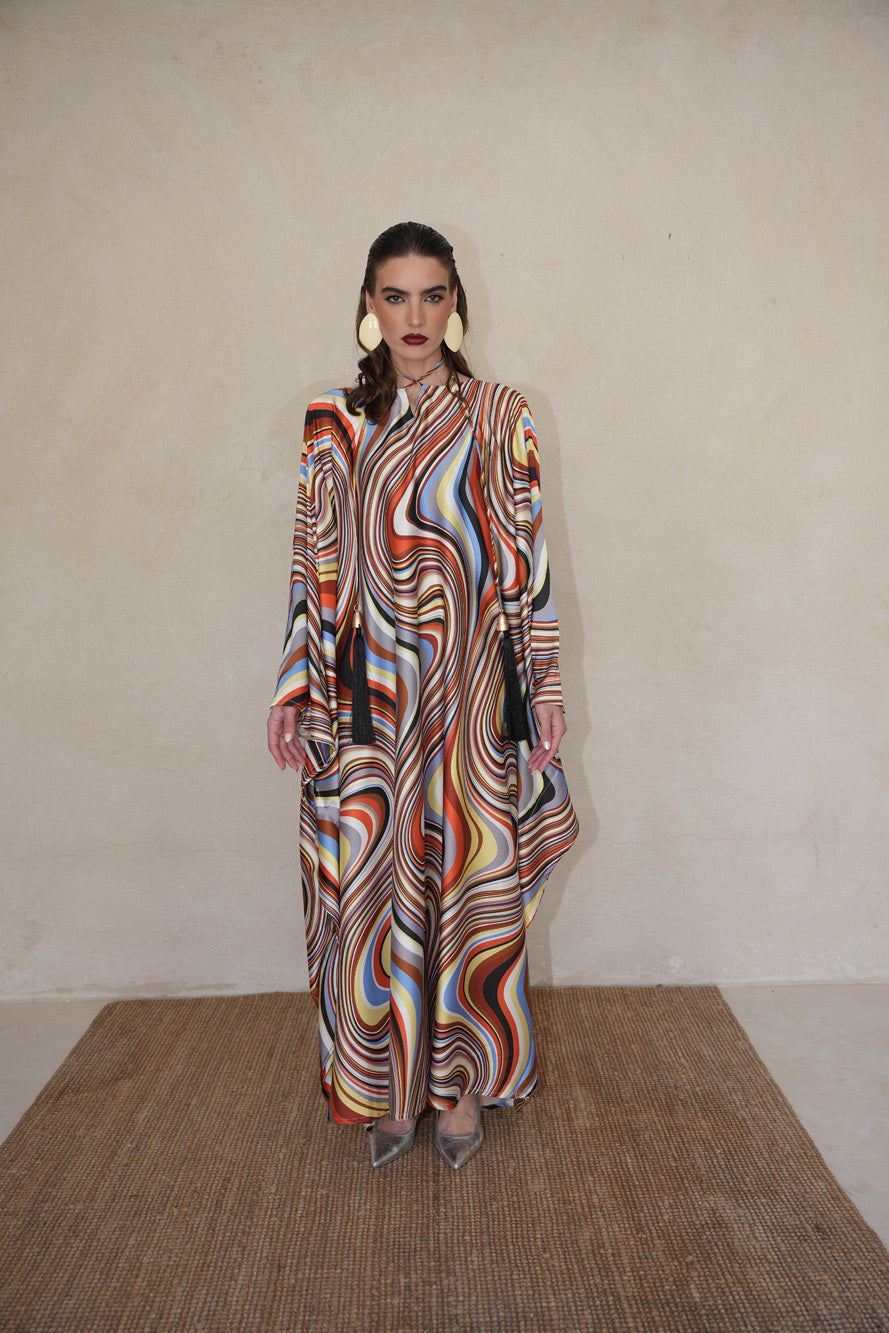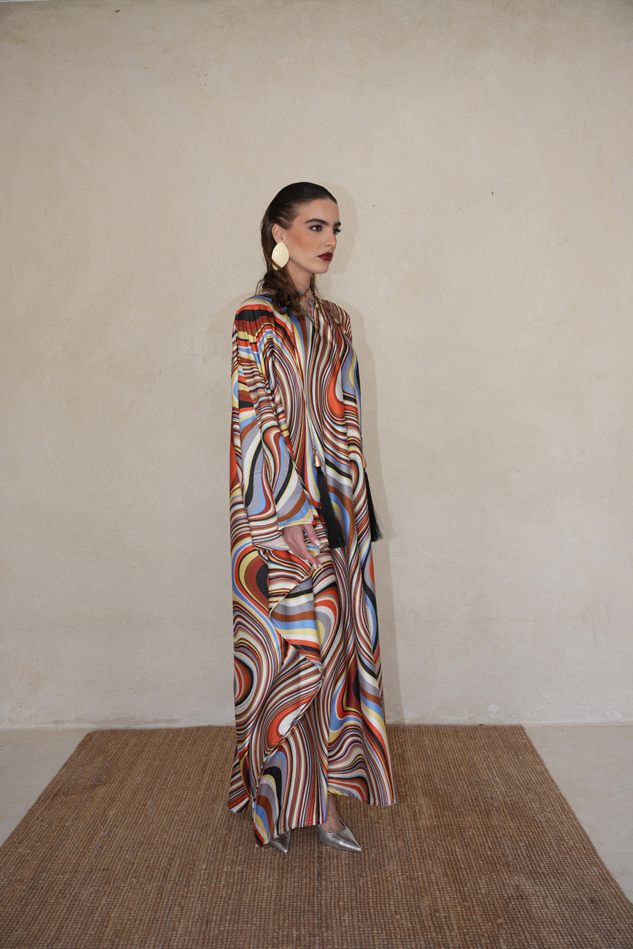 A bold swirl of sunset tones and effortless elegance. Ambera is crafted from soft, flowing fabric that moves with grace, a vibrant statement for any evening.