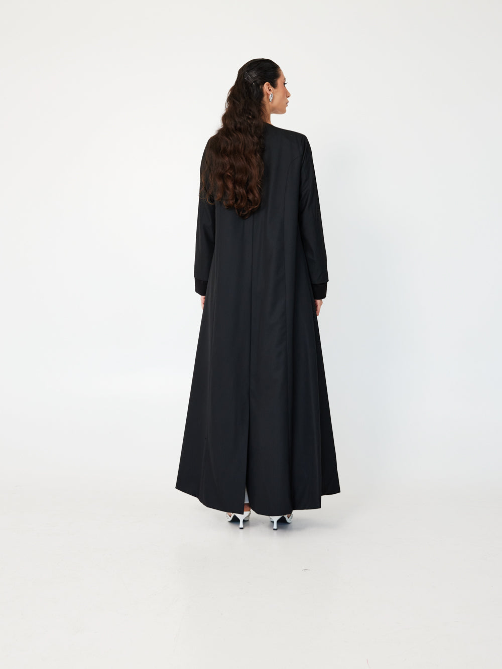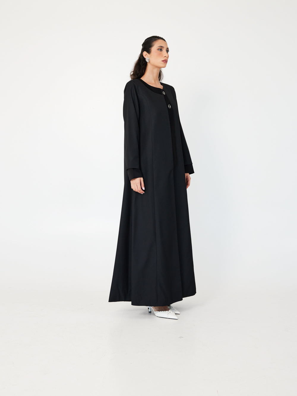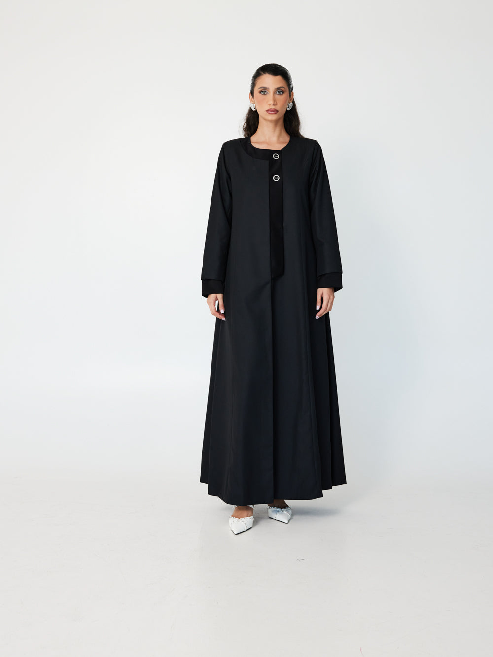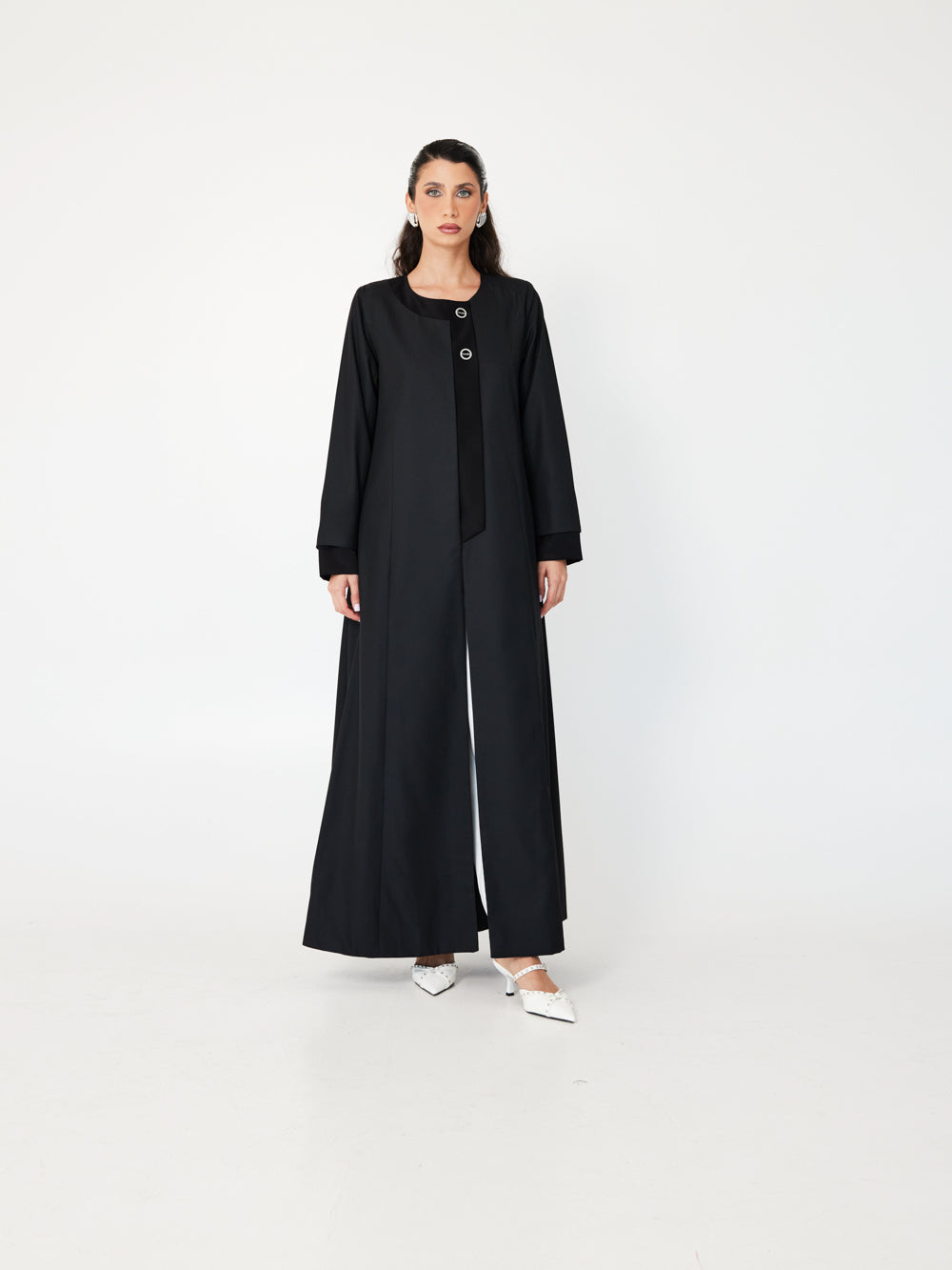 A powerfully structured black abaya with tailored lines and a single statement button. Designed for leaders, creators, and women who move with purpose.