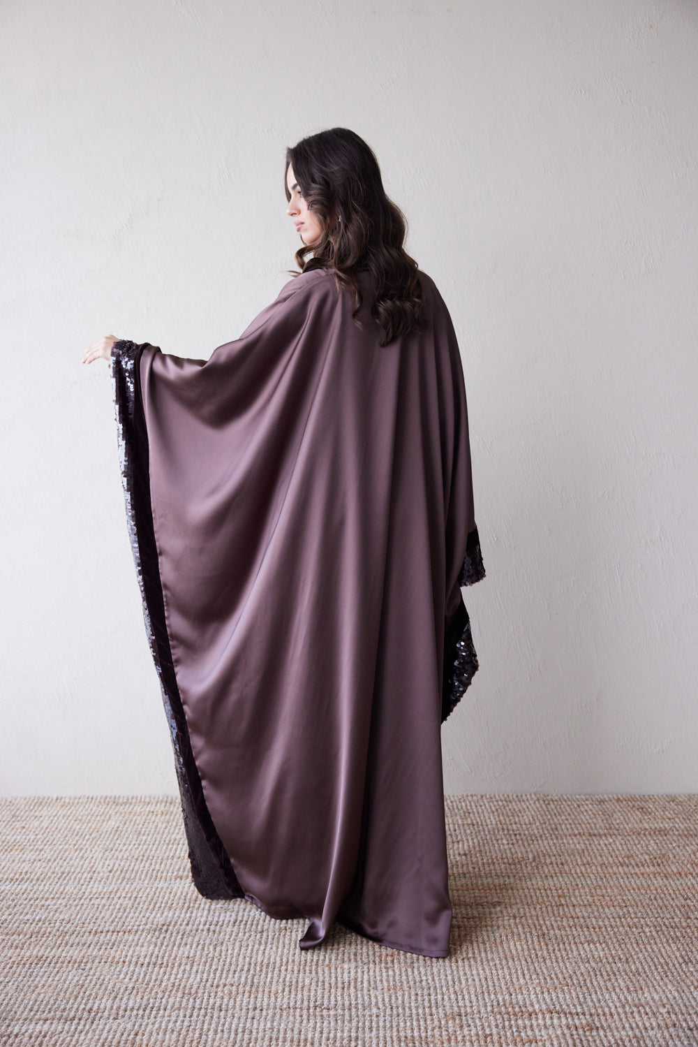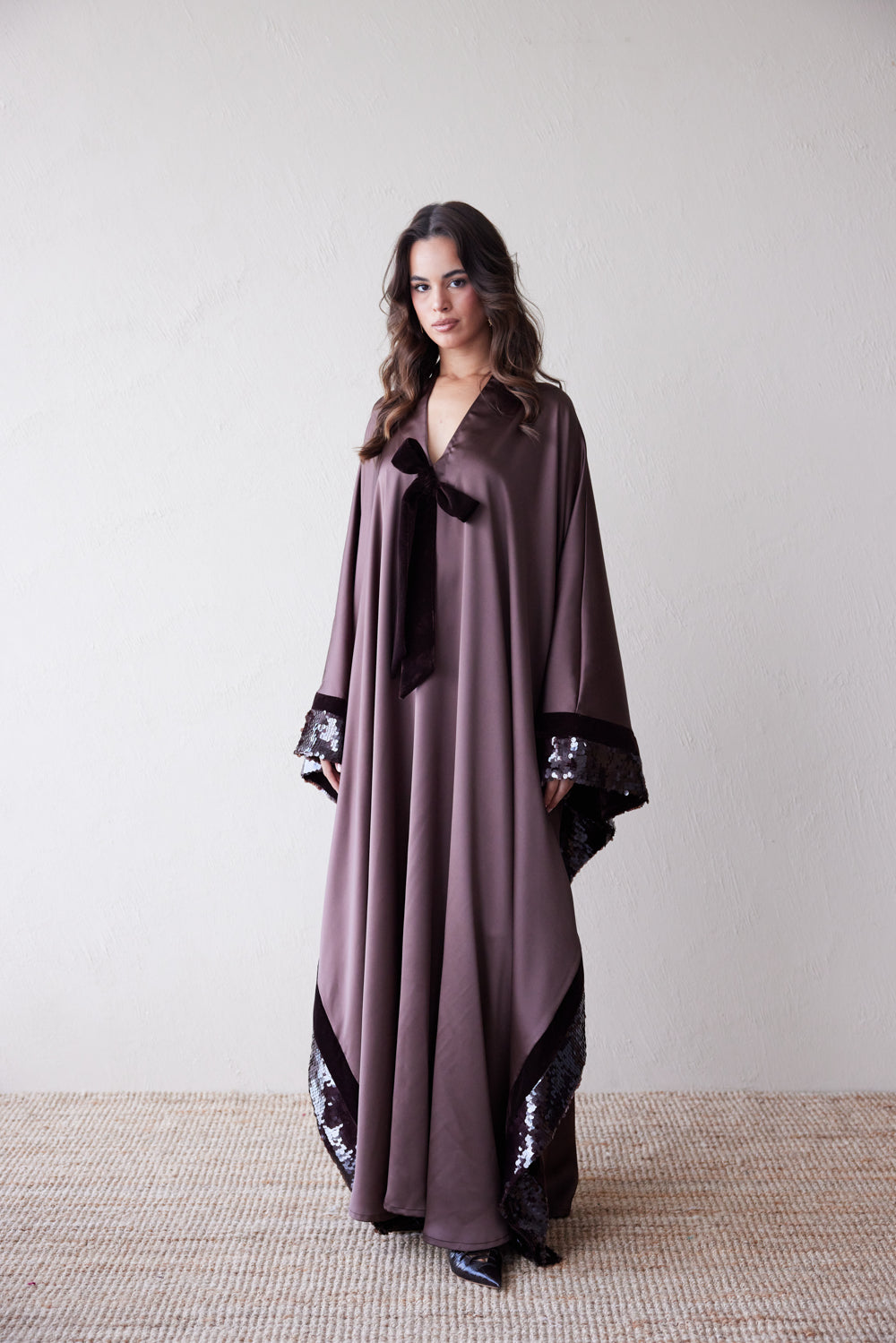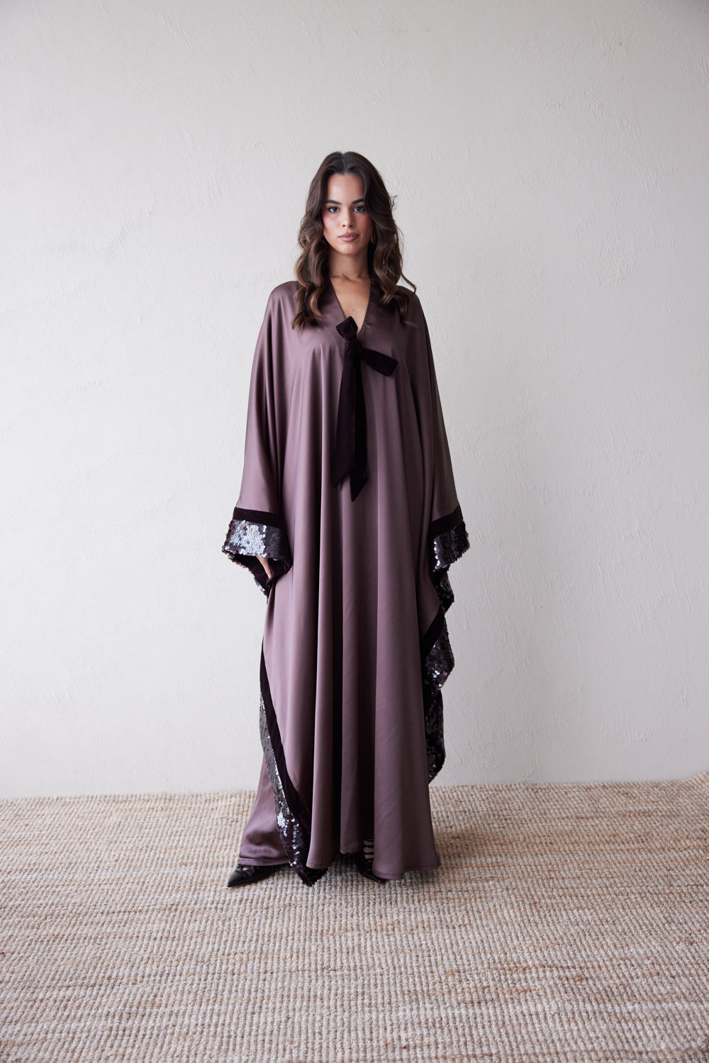 In a mink-hued satin that feels both soft and structured, this jalabiya flows with grace and gathers attention in the details: dark velvet trims, espresso sequin lace accents, and a signature tie at the neckline. Designed to take you from formal evenings to moonlit gatherings in effortless sophistication.
