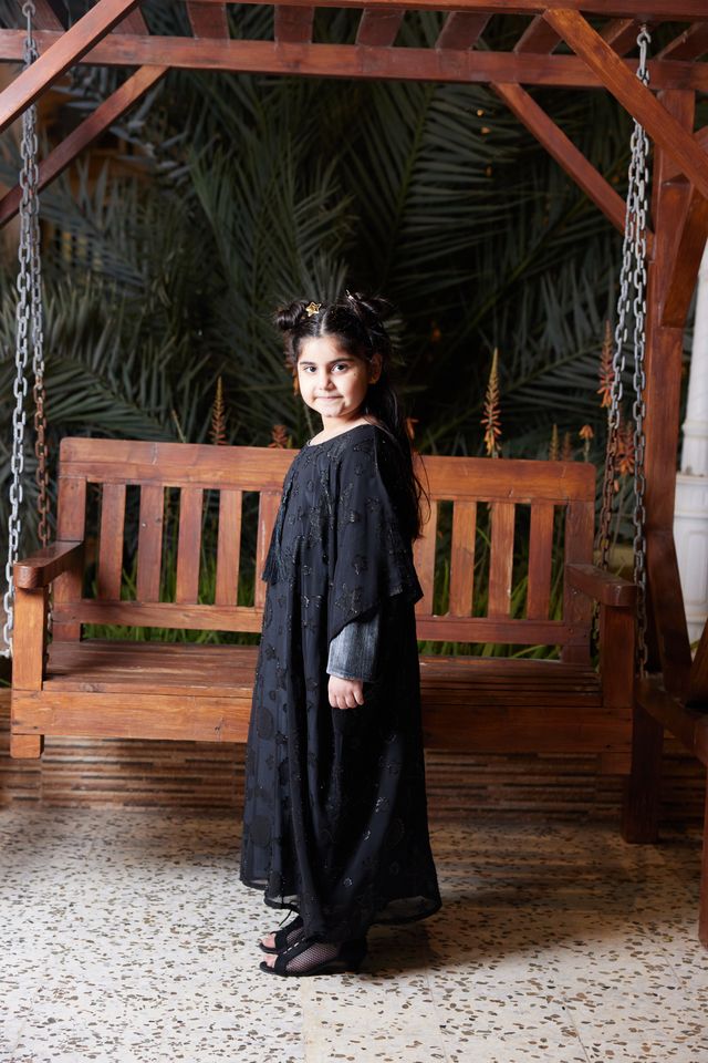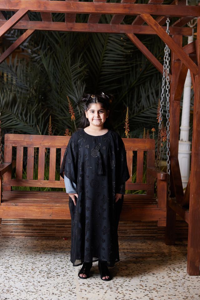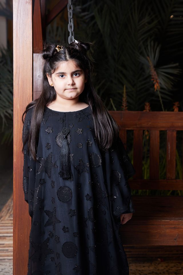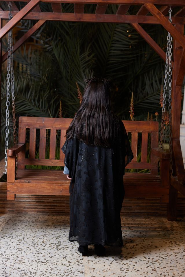 A magical two-piece set featuring a soft inner jalabiya velvet fabric paired with a flowing chiffon overlay. The outer layer is adorned with shimmering star and cosmic shape prints, creating a dreamy night-sky effect. Lightweight and elegant, this ensemble is perfect for evening celebrations and adds a touch of wonder to any occasion.