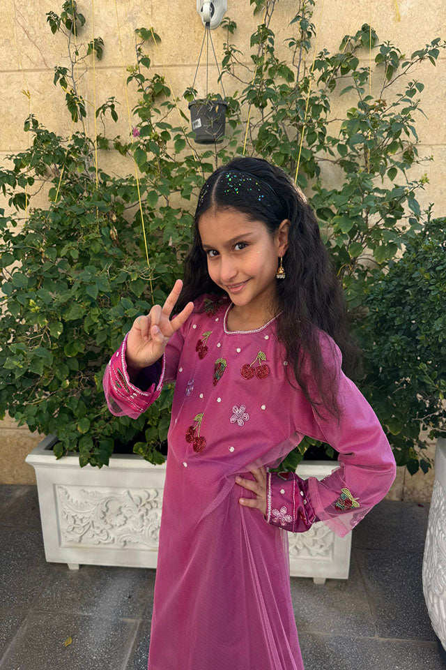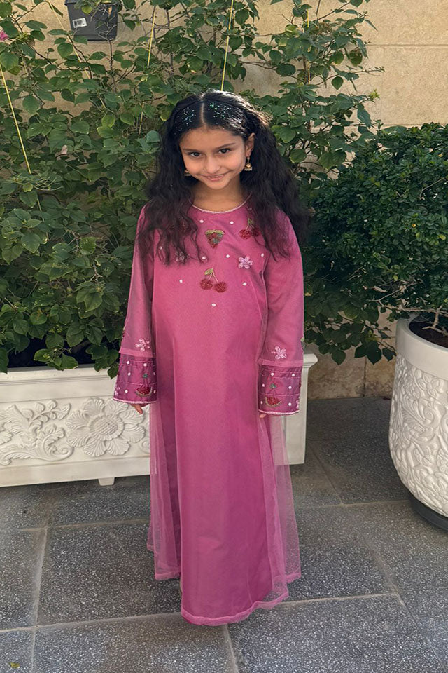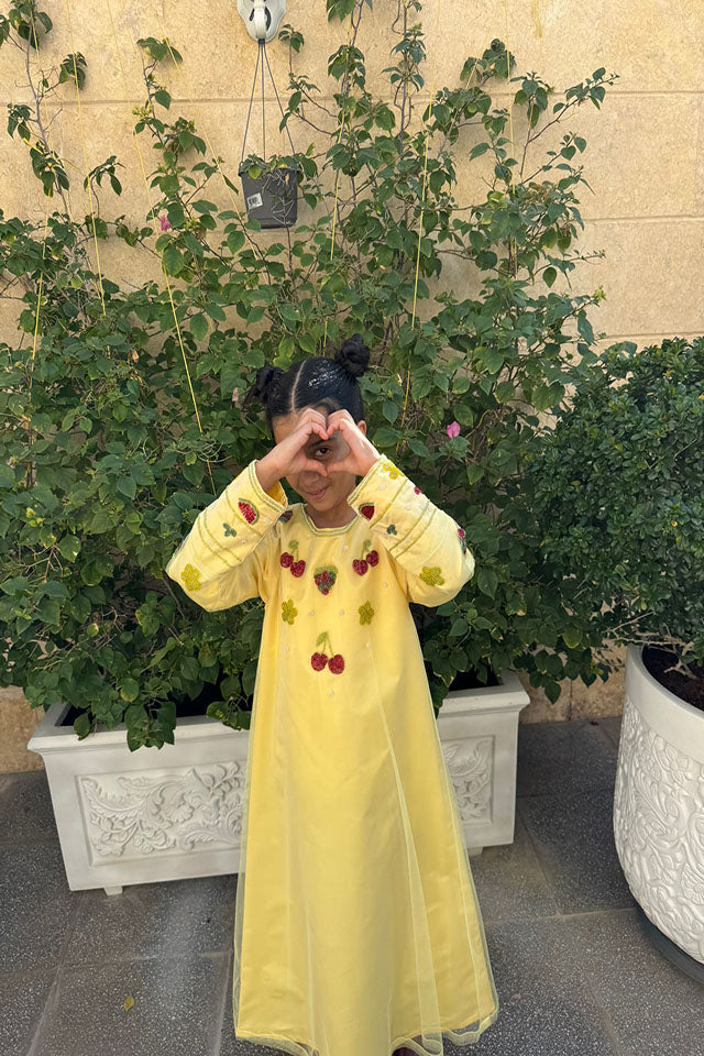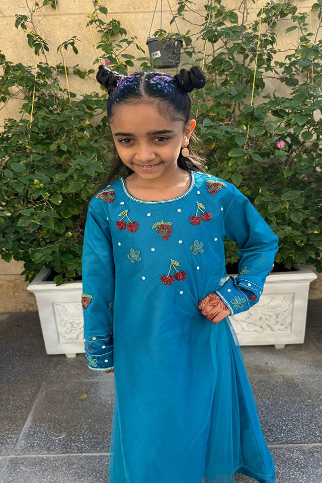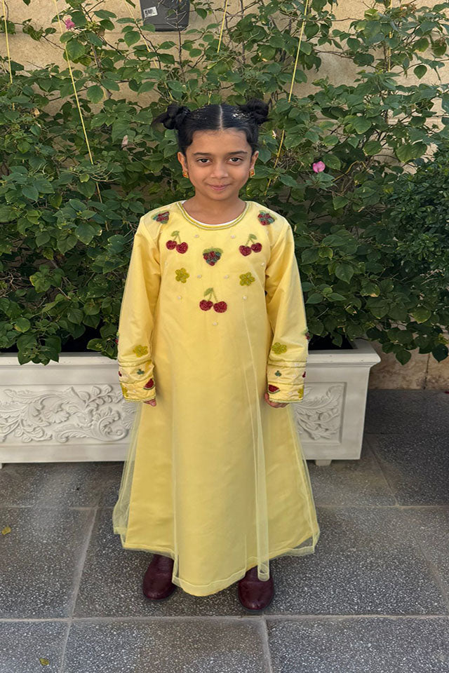 A playful and charming dress available in three delightful colors: pink, yellow, and blue. Featuring whimsical embroidery of cherries, strawberries, and floral motifs, this design is finished with delicate pearl accents and sheer mesh detailing. Perfect for festive occasions and cheerful moments, Cherry Bloom brings a fresh burst of joy in every shade.