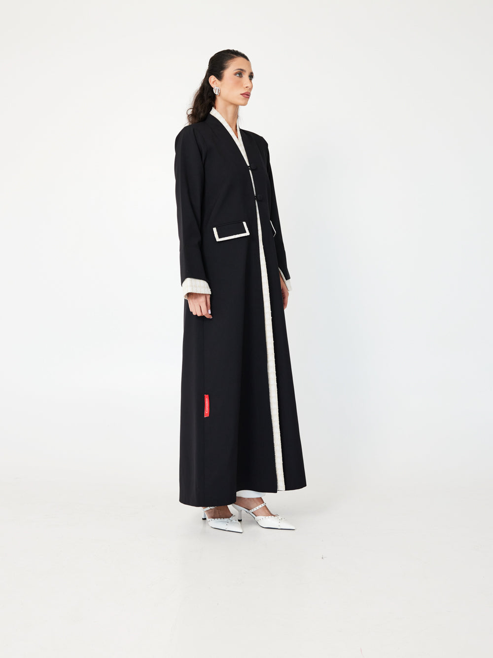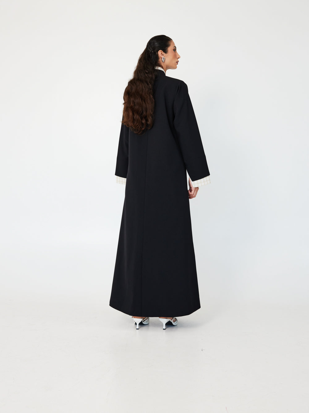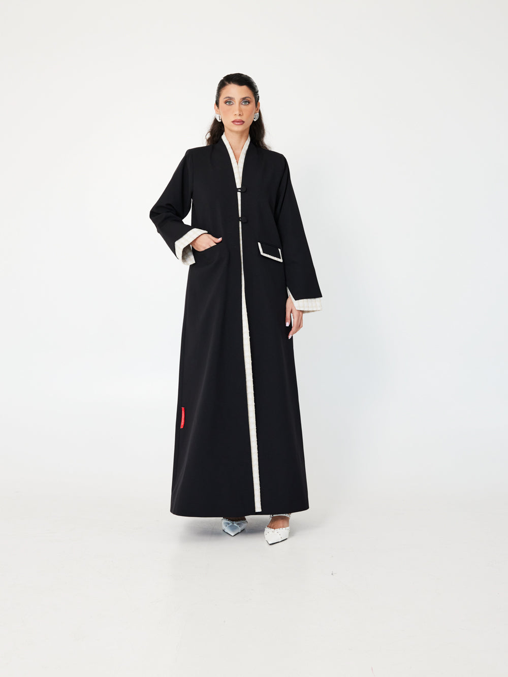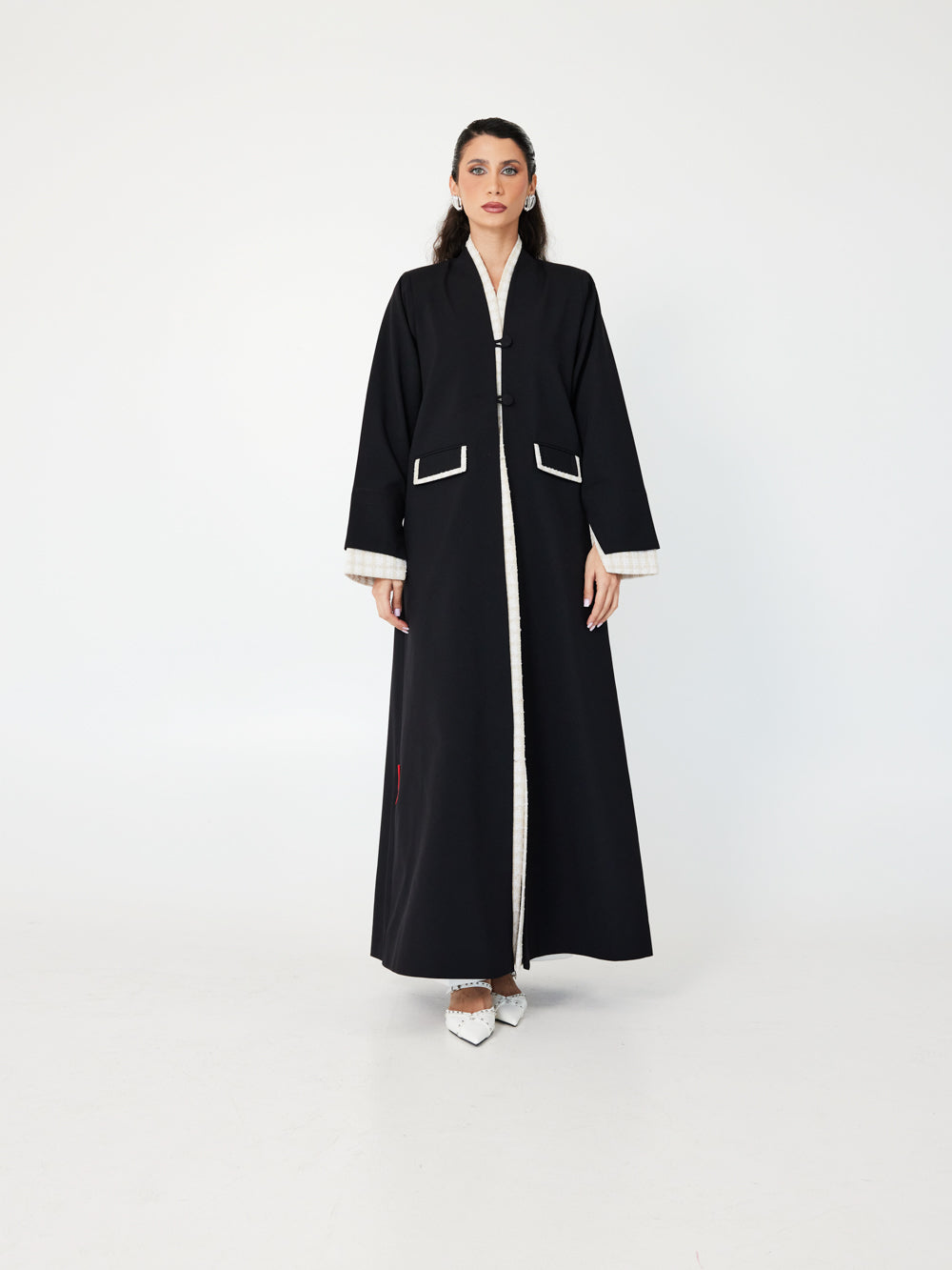 With ivory trim and loop-button closures, Crème Edge brings Parisian elegance to a modest silhouette. A striking contrast abaya for refined occasions.