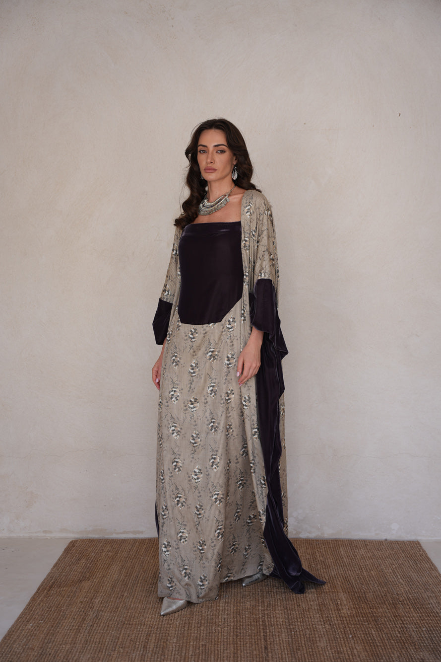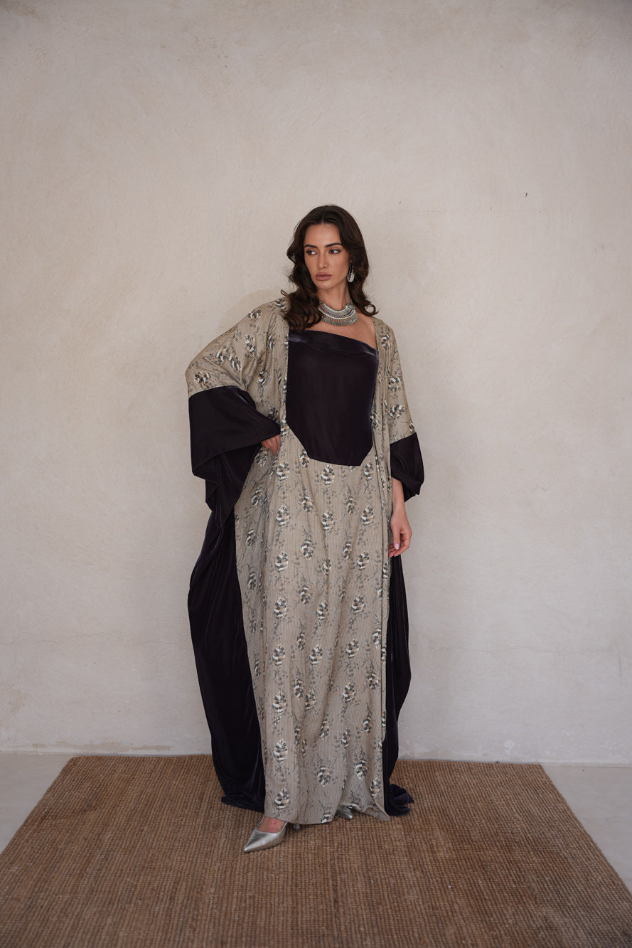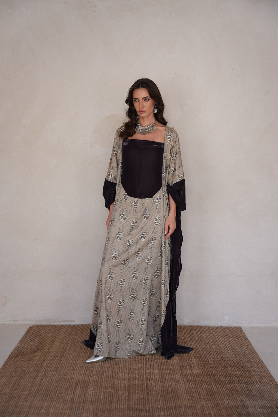 Dusk Sand is designed in earthy taupe tones paired with deep chocolate brown, evoking the richness of desert twilight. The flowing silhouette is adorned with subtle floral prints, bringing softness to the structured elegance. Understated yet refined, it’s a graceful harmony of grounded tones and timeless allure.