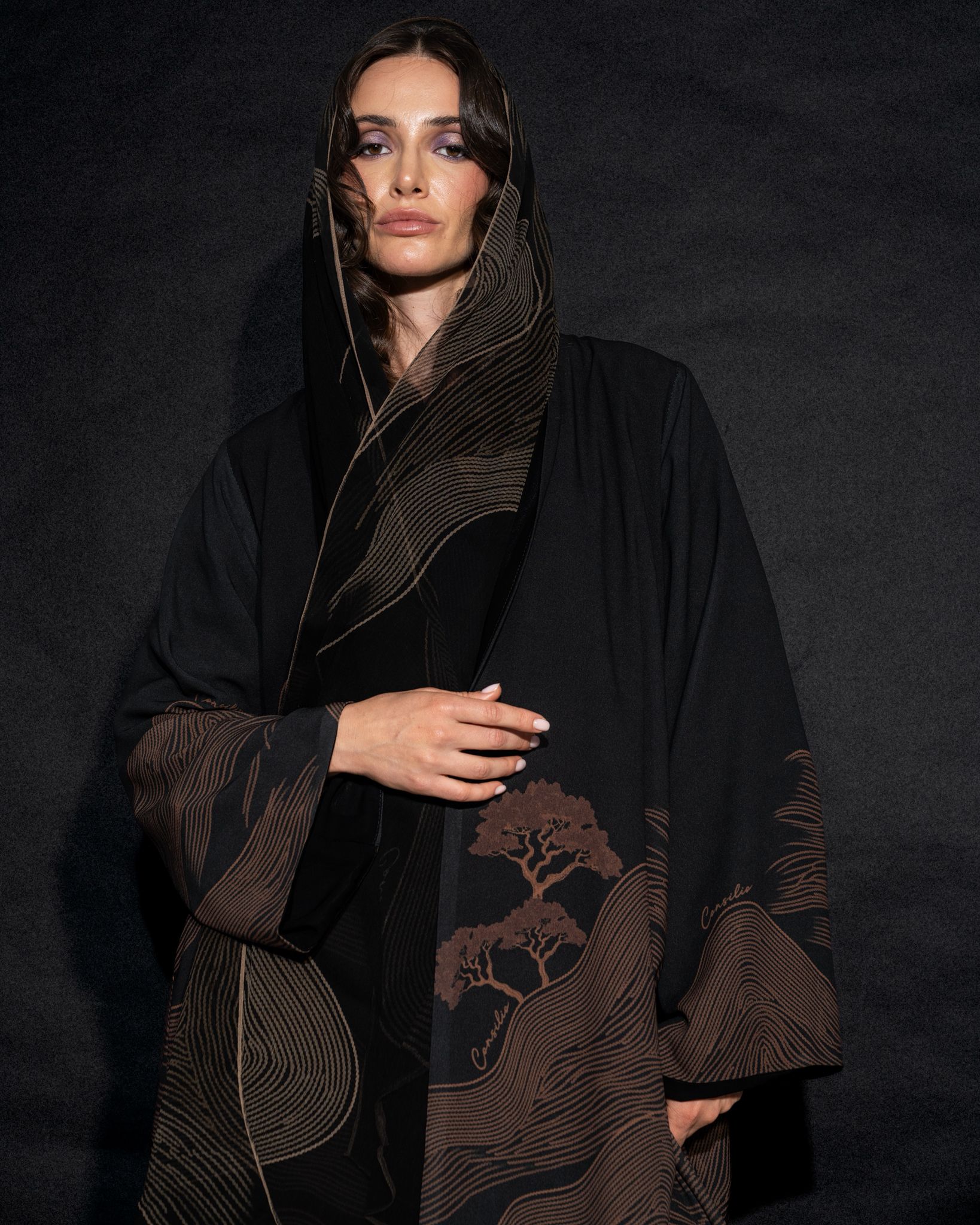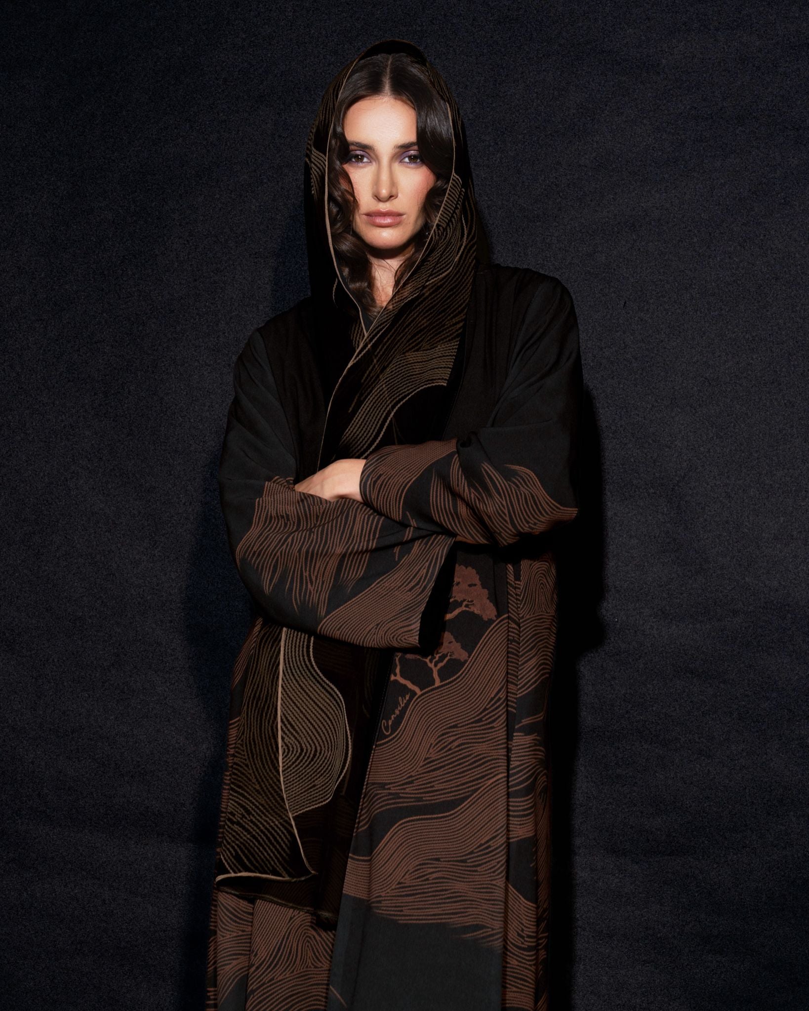 Designed in our signature printed crepe fabric, this abaya features warm, earthy shades of brown for a timeless and natural elegance. The lightweight crepe drapes beautifully, offering comfort and sophistication in every step. A refined choice for effortless everyday luxury.