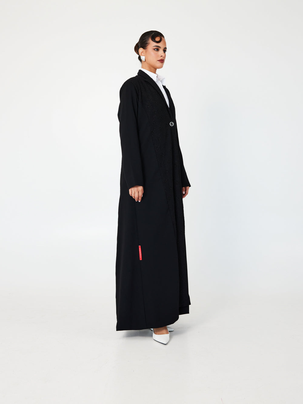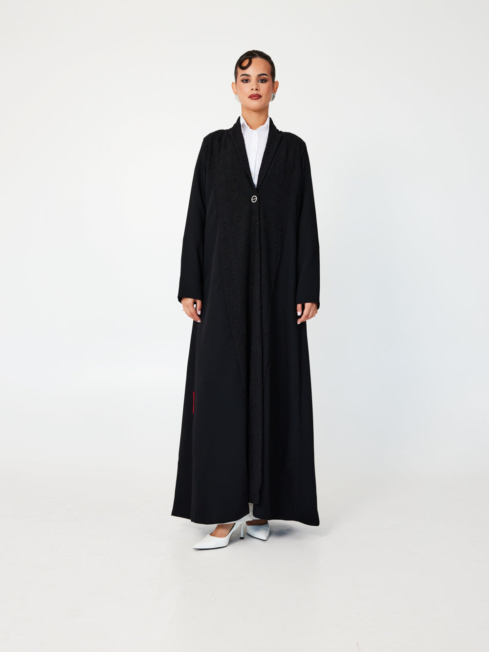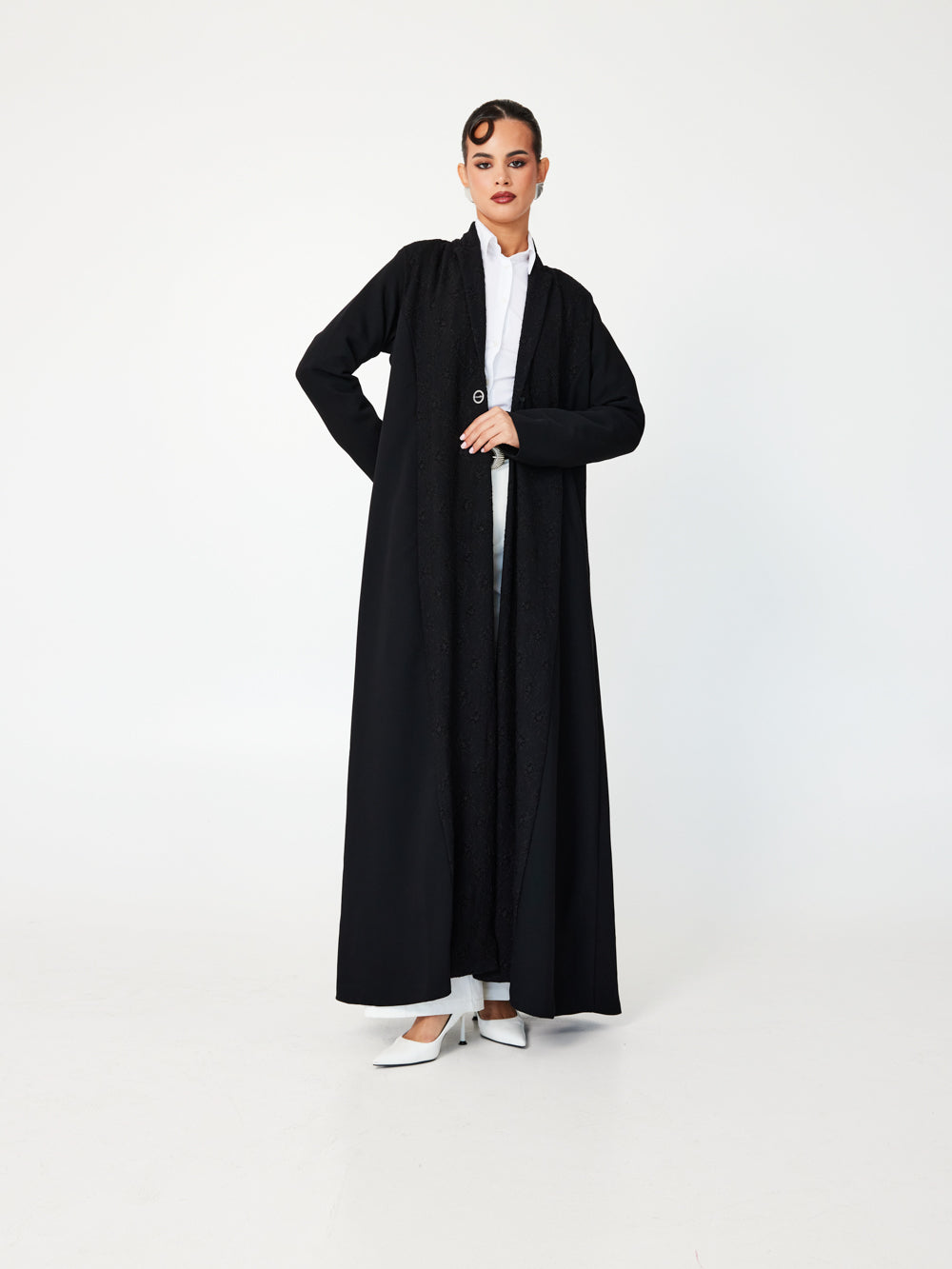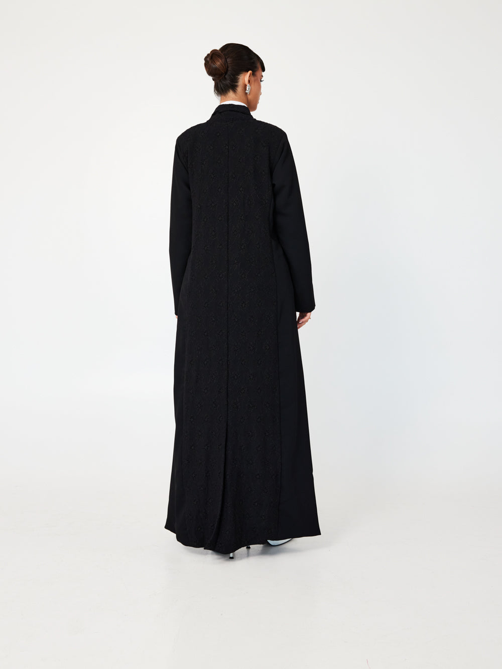 A black jacquard abaya with tonal floral texture woven into the fabric. Feminine, graceful, and mysterious — perfect for evening wear or when you want a touch of detail without embellishment.