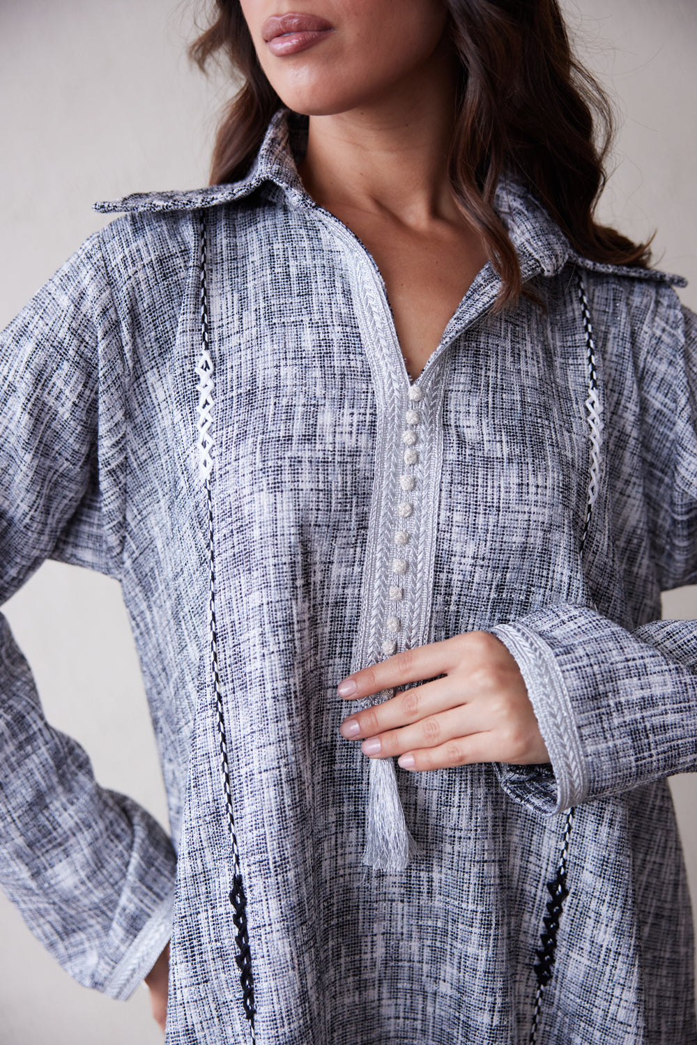 Crafted in a soft, textured grey fabric with delicate white embroidery, this piece brings together comfort, structure, and timeless ease. Ideal for slow mornings, serene nights, and every graceful moment in between.
