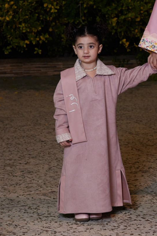 A soft blush-pink suede jalabiya designed with elegance and ease for little girls. Features textured cuffs and collar for a refined finish, with side pleats for added movement. Comes with a matching sash in leather-touch fabric, personalized with your child’s name in delicate embroidery.