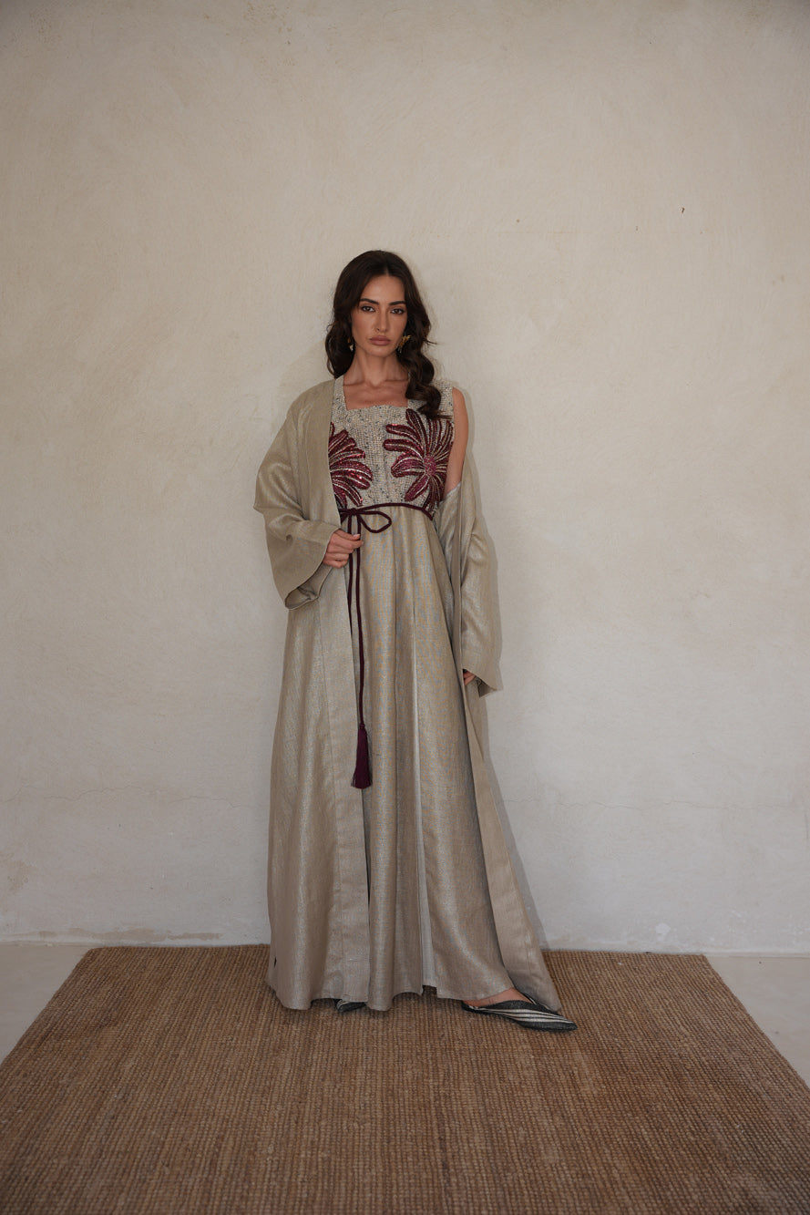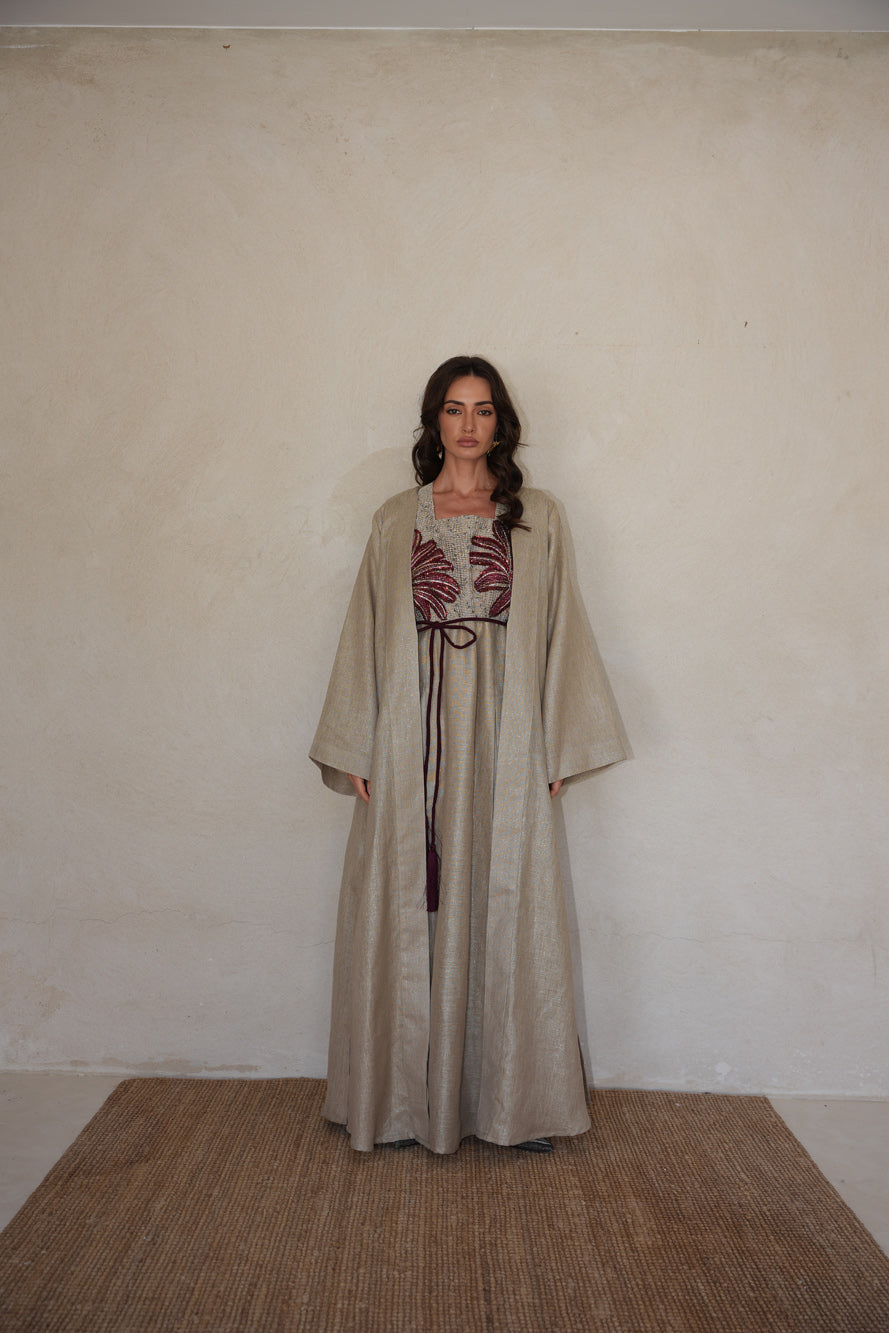 Rose Mirage is a three-piece set featuring an embroidered inner dress, a flowing outer layer, and a soft tasseled belt. Designed in warm neutral tones with deep rose floral detailing, it captures the beauty of a desert bloom and the grace of movement. A poetic blend of softness, strength, and subtle statement.