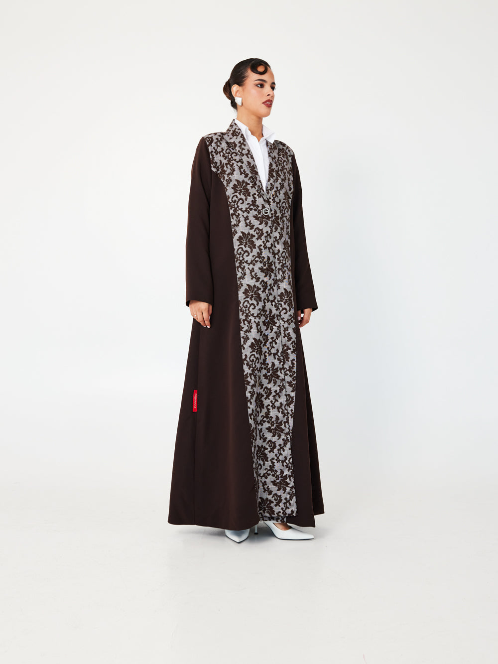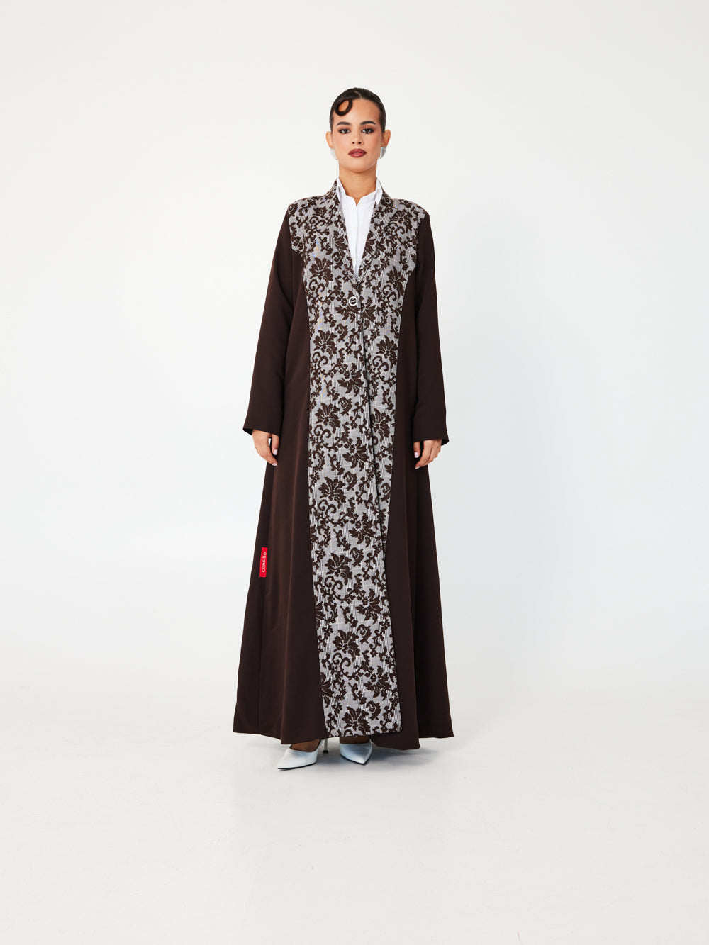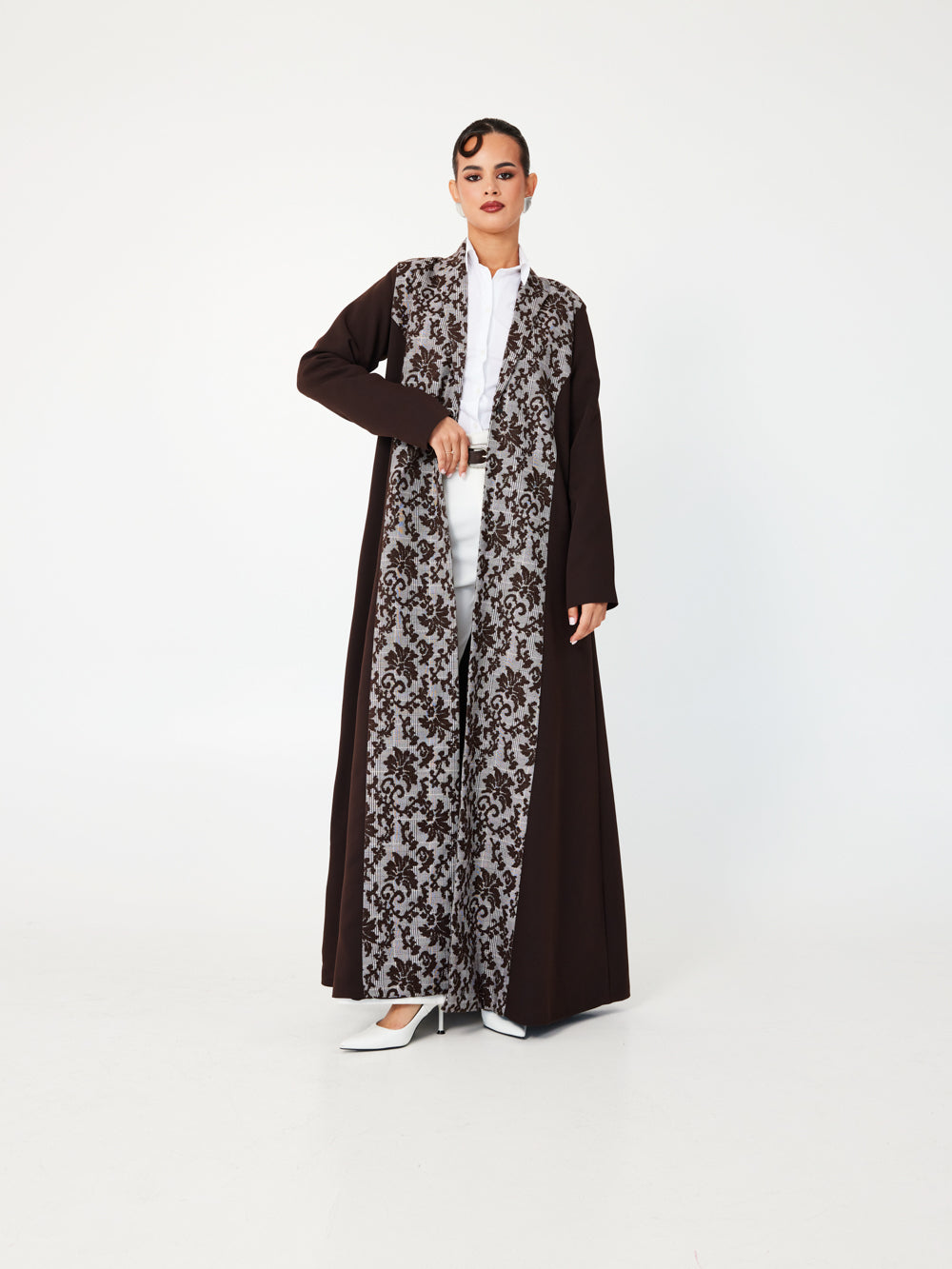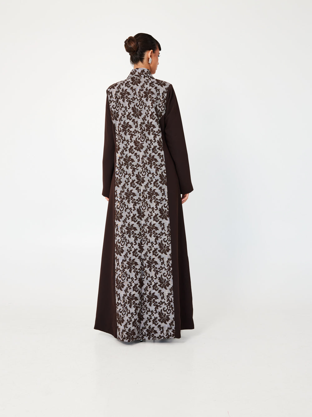 A graceful abaya in a rich rosewood hue, featuring subtle floral jacquard texture that adds depth and elegance. The soft tone and light-reflecting pattern create a romantic, elevated silhouette, perfect for daytime events, Eid, or garden evenings.