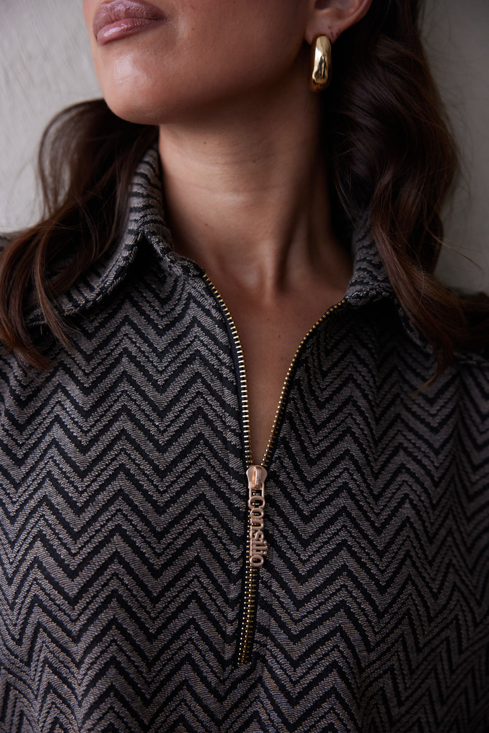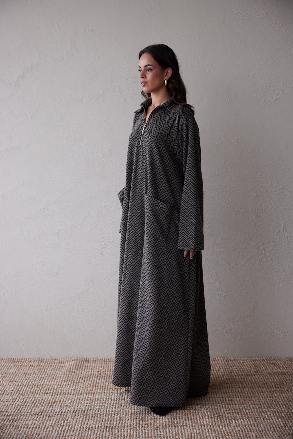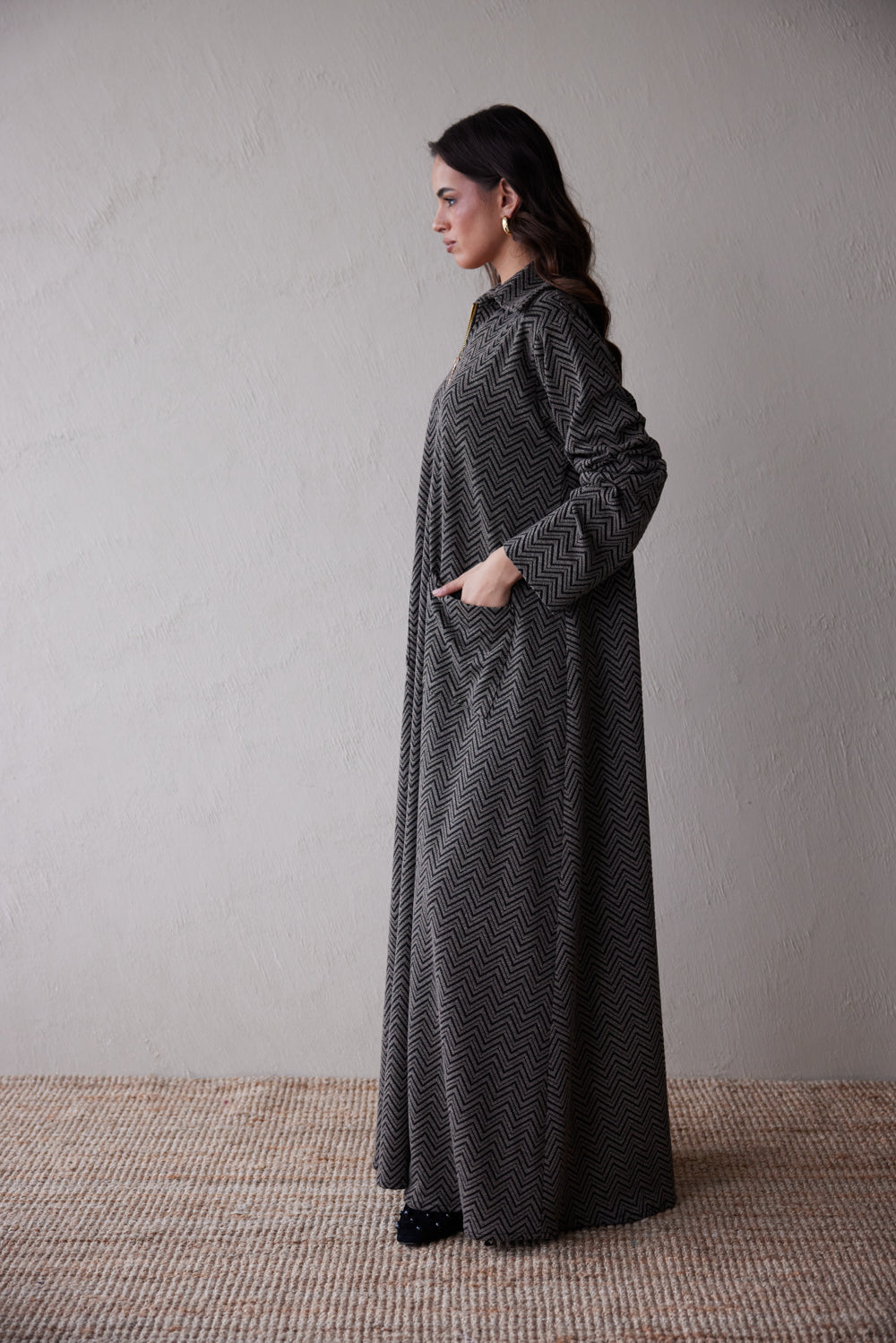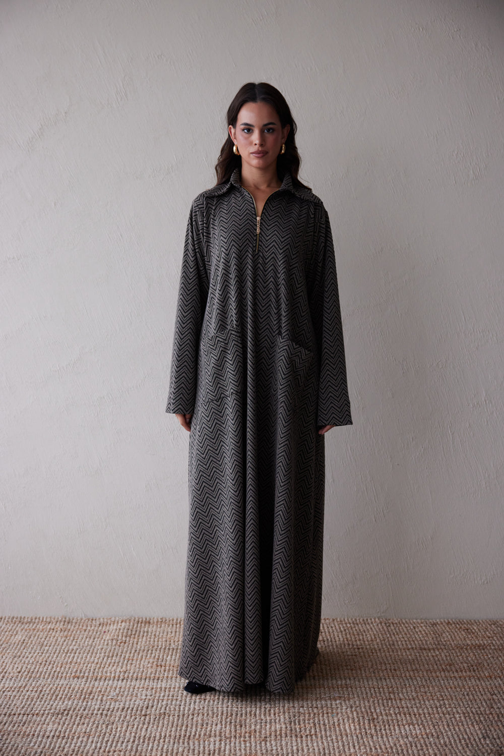 Crafted from a soft knit with a bold chevron pattern in charcoal and black, this jalabiya offers warmth, texture, and an effortlessly polished silhouette. A standout feature is the gold Consilio-branded zipper, offering convenience with a signature twist. Sleek. Understated. Confident.