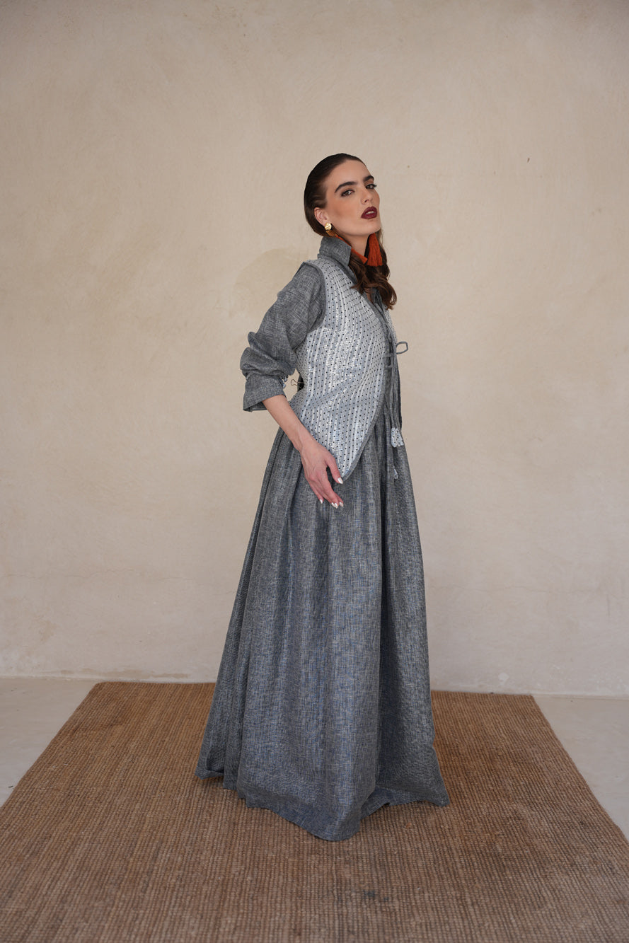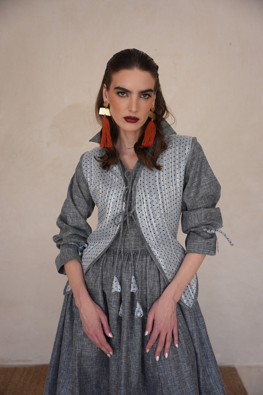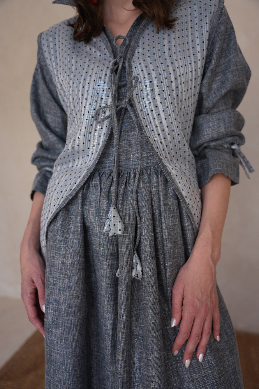A contemporary two-piece set featuring a flowing linen shimmer dress paired with a structured polka dot sequin vest. Sora Ash blends earthy tones with subtle sparkle for an effortlessly refined look.
