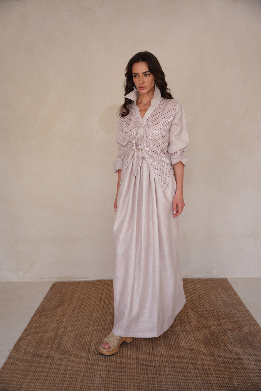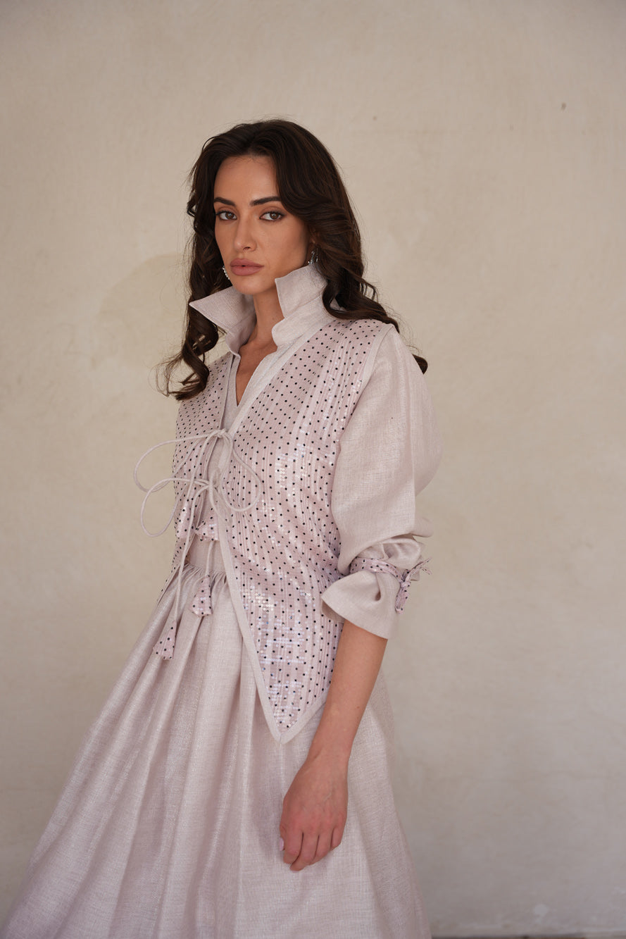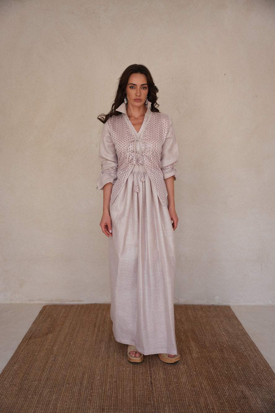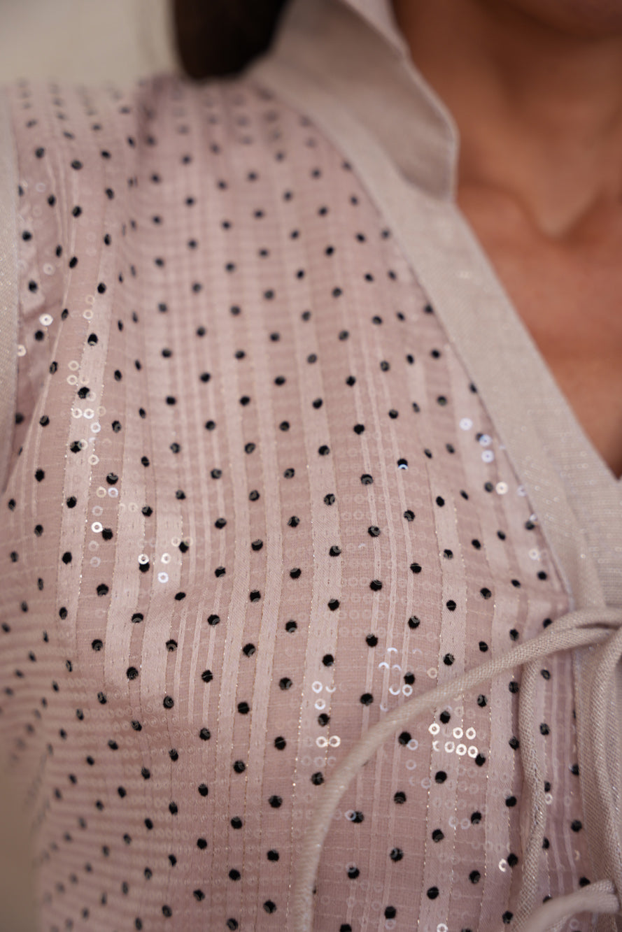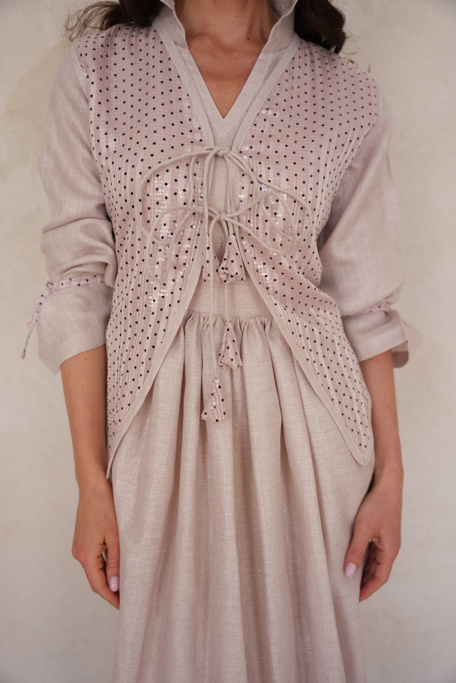 A delicate two-piece set in soft blush tones, featuring a flowing linen shimmer dress layered with a polka dot sequin vest. *Sora Blush* blends gentle sparkle with effortless femininity for a timelessly graceful look.