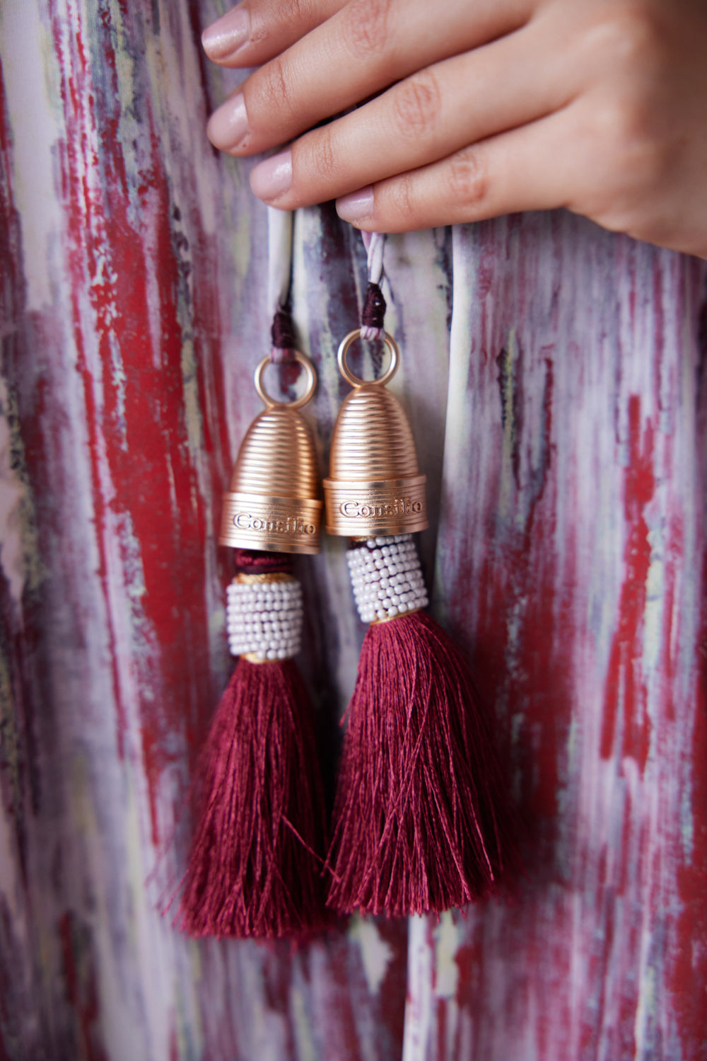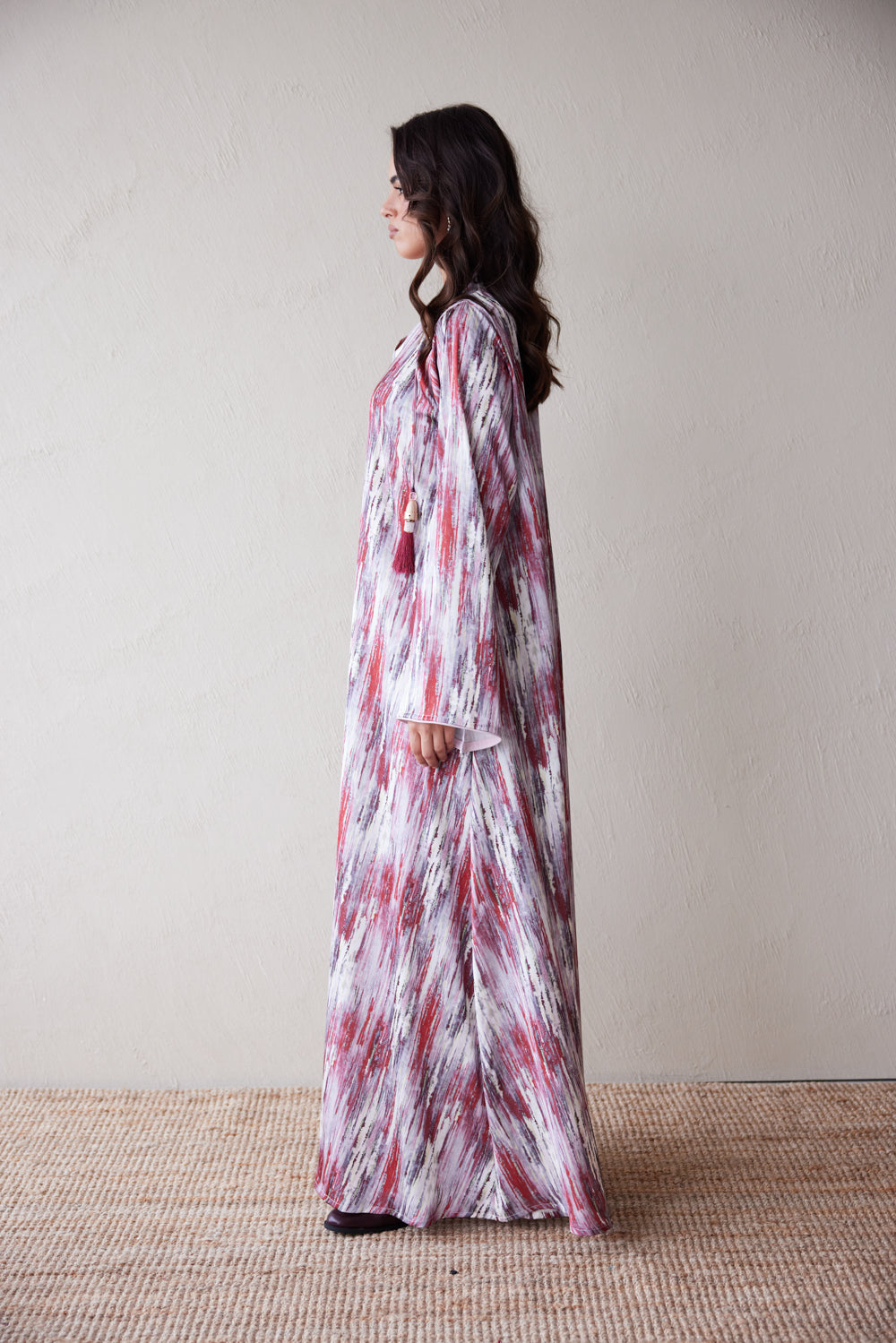 Featuring fluid brushstroke textures in warm tones and finished with custom maroon tassels and a gold piece engraved with our logo, this jalabiya blends contemporary design with Consilio's signature identity. Lightweight, flowy, and effortlessly elevated, it’s perfect for day-to-night dressing.