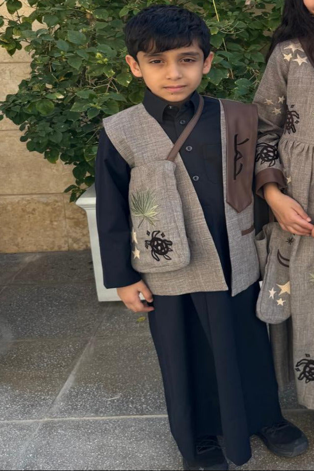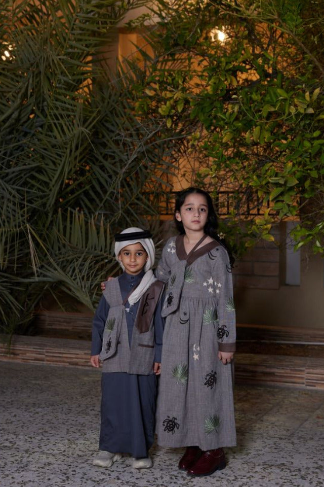 A beautifully coordinated set for both boys and girls, Starry Palm blends nature and tradition in a modern silhouette. Crafted from soft-textured fabric, the outfits are adorned with palm tree motifs, stars, turtles, and crescent moons, creating a whimsical yet grounded look inspired by desert nights and island dreams. The girls’ dress features a matching crossbody bag for added charm, while the boys’ vest is uniquely customizable with their name, adding a personal touch to this elegant ensemble. A perfect choice for festive occasions and sibling coordination with style.