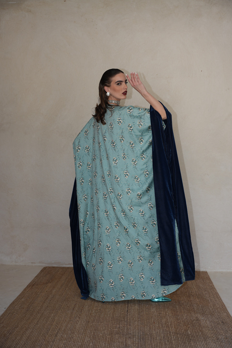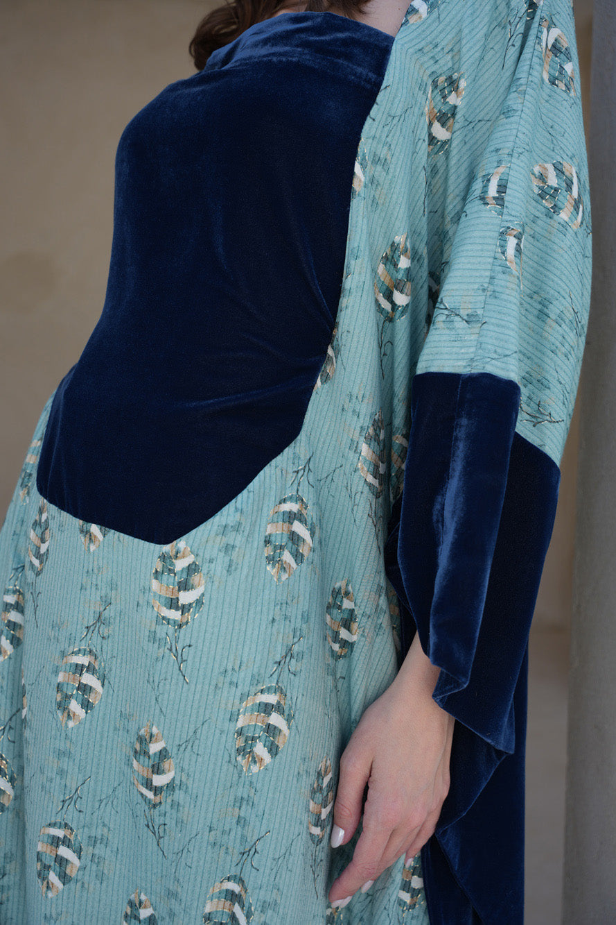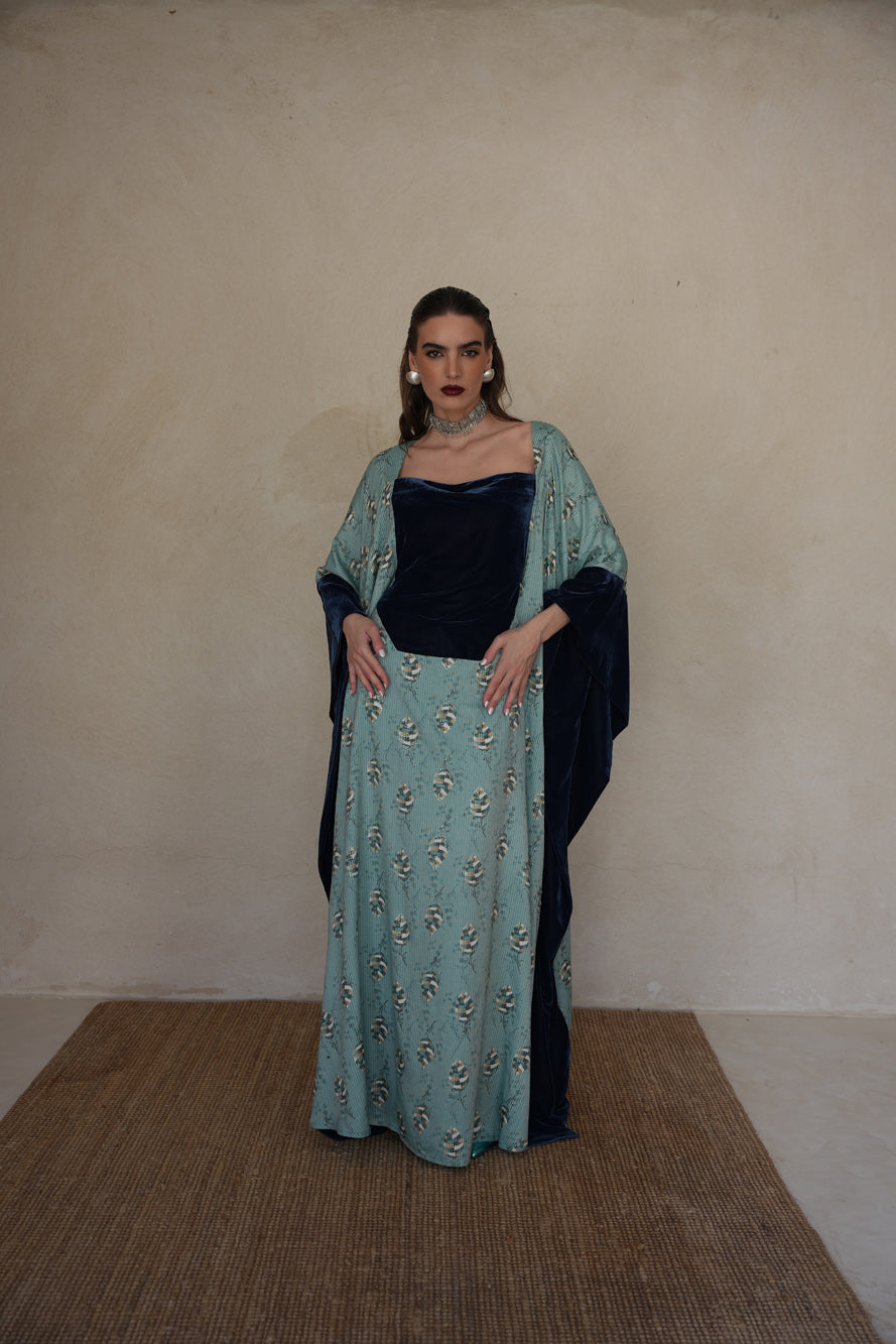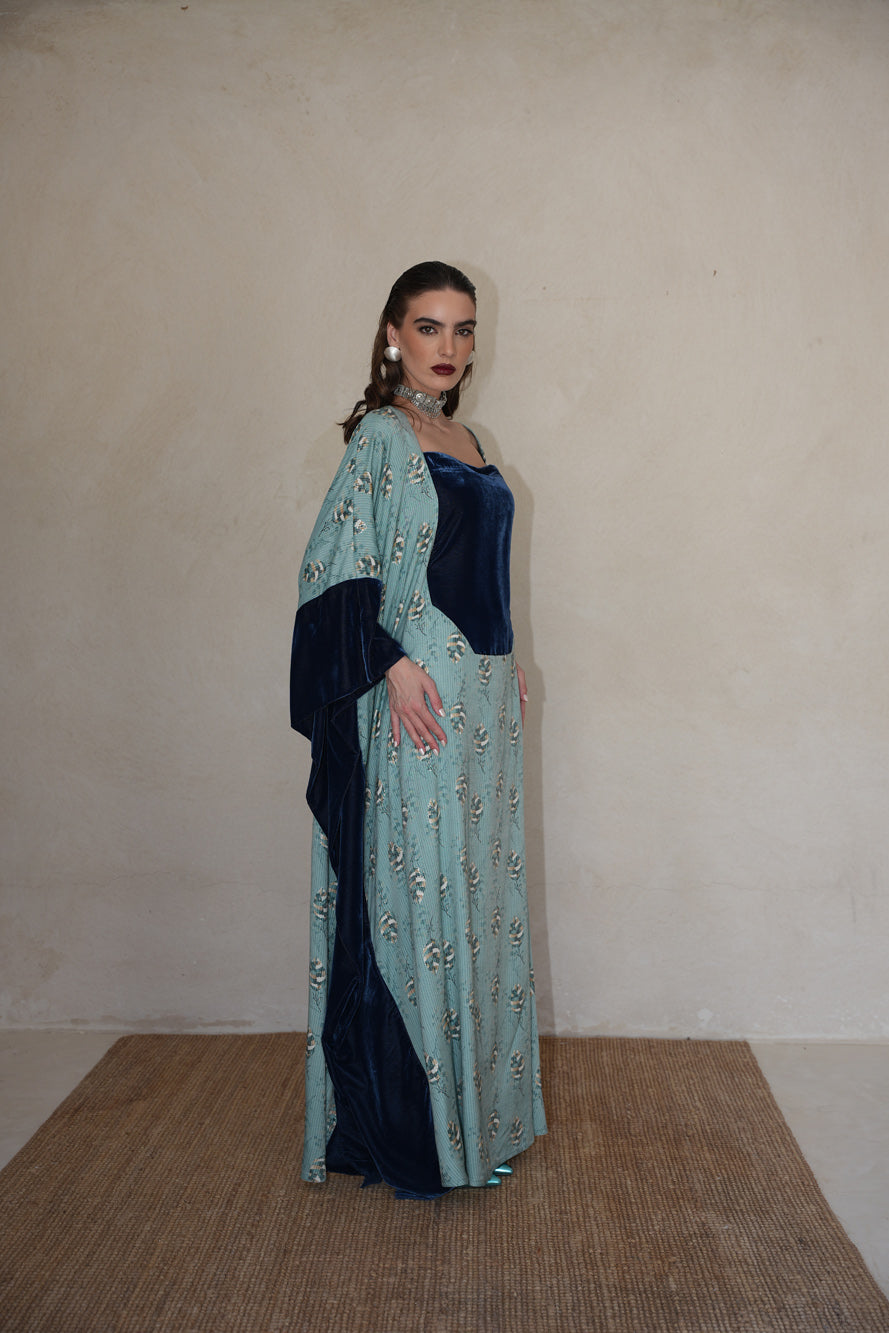 Velvet Cypress blends deep midnight-blue velvet with a flowing sage base patterned in delicate floral motifs. The rich textures and graceful drape create an air of refined elegance, while nature-inspired tones evoke stillness and strength. A quiet, powerful ode to timeless femininity.